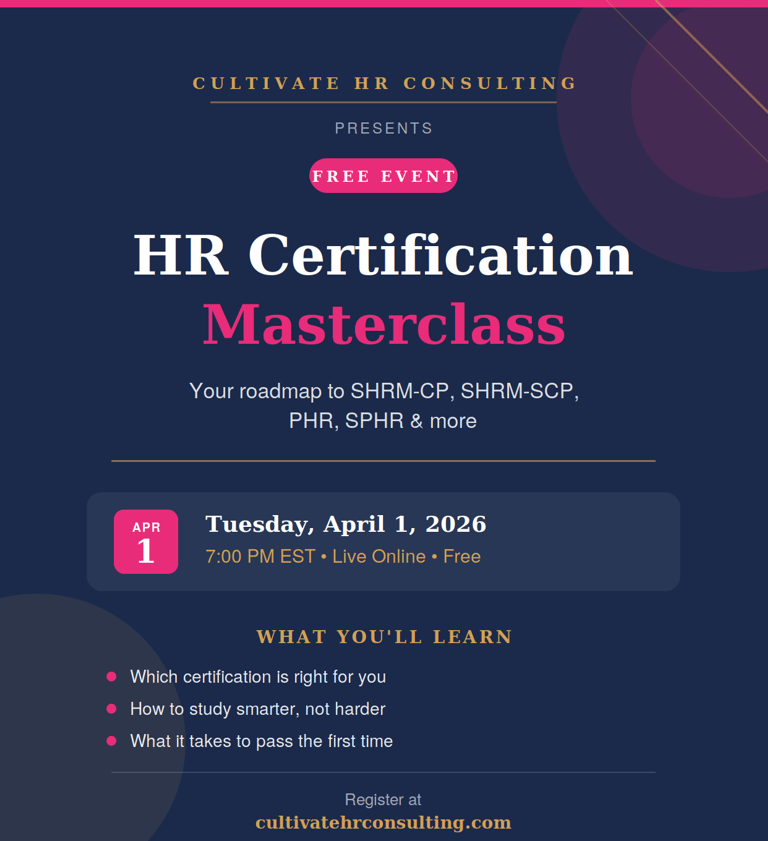 Whether you're preparing to sit for your SHRM-CP, SHRM-SCP, PHR, or SPHR, Cultivate Human Resources gives you the structured guidance, practical application, and expert support to succeed.